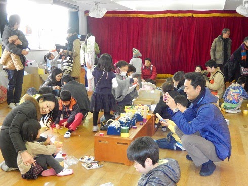 遊戯室では、空き箱などを使って制作。親子で 友達と 楽しく作っていました。