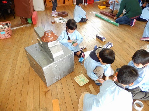 さて、年長組は今まで読んでもらった絵本の中からみんなで相談して1冊の本を選び、その本の世界を部屋で作っていきます。
