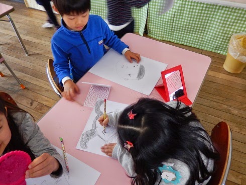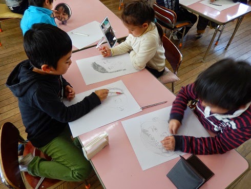 それを、鉛筆で描いていきます。一生懸命描いていました。中には自分の顔とそっくりに描けた子もいたようです。