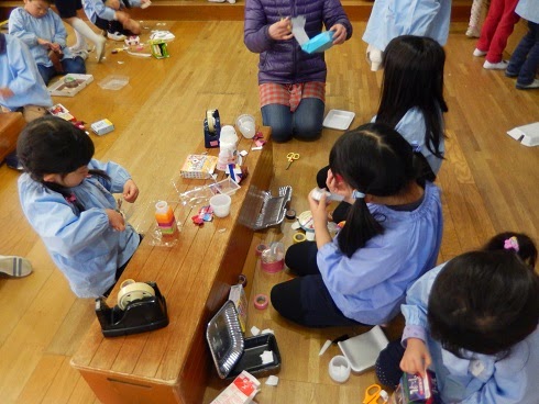 色々な材料の中から自分達で必要なものを選んで、道具を上手く使いながら想像したものを形にしていきます。