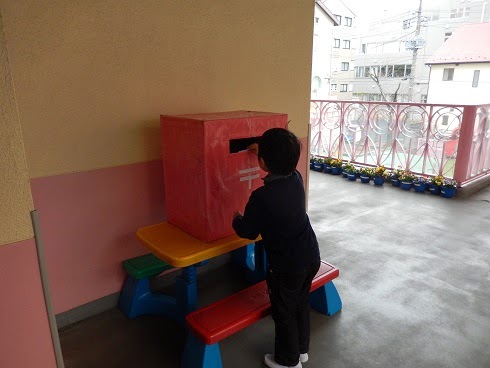 まだ「郵便屋さん」の仕事がきちんと理解出来ていない子もいるようですが、先生の話を聞きながら配達したり、友達との手紙をやりとりしたりし、楽しんでほしいと思います。