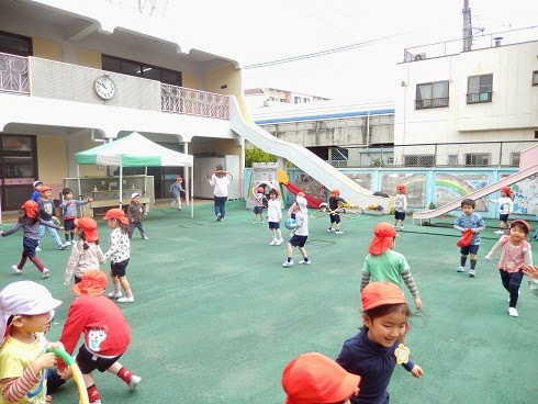 年少組が部屋に戻った後には、年中・年長組が園庭に出てきました。