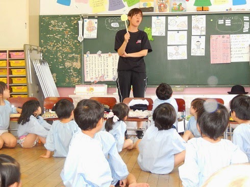 先生の話を真剣に聞いています。自分の椅子に座って話を聞けるようになっていました(子どもって自分の場所が定まっていると、落ち着いていられることが多いのです)が、今日は椅子がなくても先生の話をしっかり聞いています。