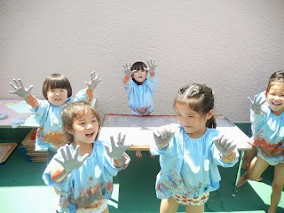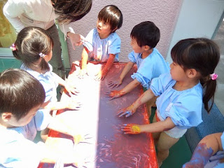 今日の活動では、色々な感触を味わう・色が混ざることで変化していく ということをねらいに行いました。子ども達が充分に楽しめるよう、お手伝いのお母さんたちにも来ていただきました。