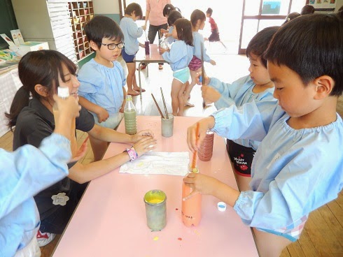 赤・青・黄色・白 のどの色を使うか考え、筆でペットボトルの中に入れていきます。
