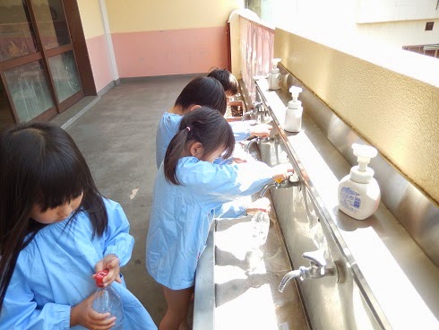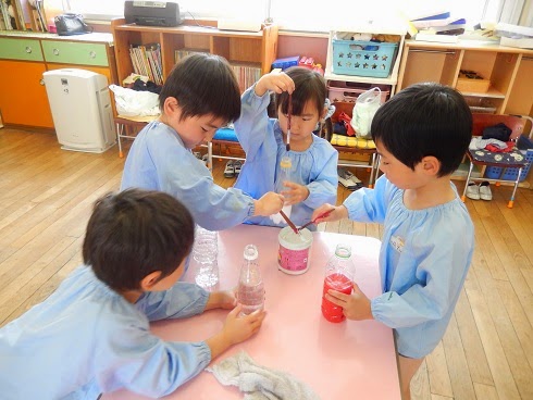 今日は、色水遊びに挑戦。先生から色を混ぜると変わるという話を聞いたり、色水の作り方を聞いてからスタートです。