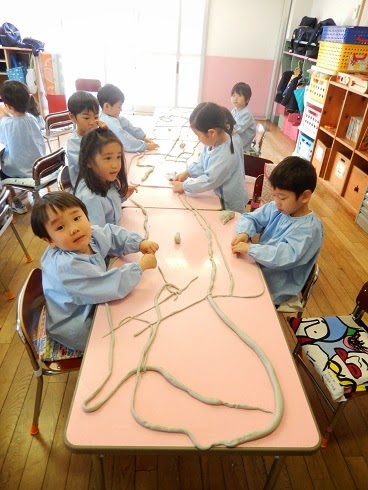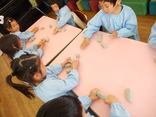 新しい粘土をもらい、今日はテーブルの上で、叩く・ひねる・切る・丸める などしました。
