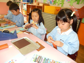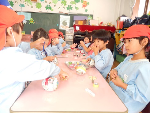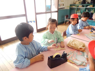 今日は、年長・年中が一緒になってお店の品物を作っています。年長組は、優しく教えてあげてくれていましたよ。