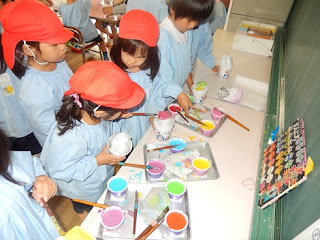 かき氷。氷を作るために、新聞紙を丸めたり、その上を和紙で包んだり。最後にはシロップの色をつけました。
