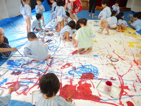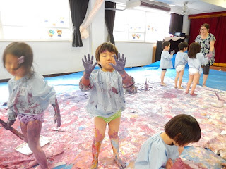 楽しくなって自分にも色をつけて楽しむ子も・・・!!たまにの事なので、充分に楽しむことを心がけました。終了後には身体を洗いましたが、お風呂の時にびっくりされた方もいたことと思います。