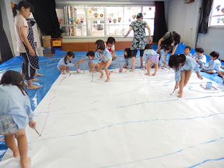 大きい白い紙の上に、筆で絵の具の線をつけていきます。