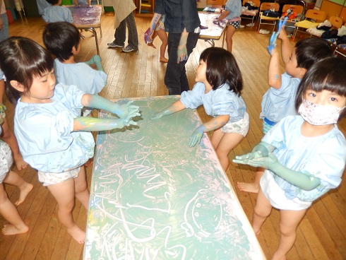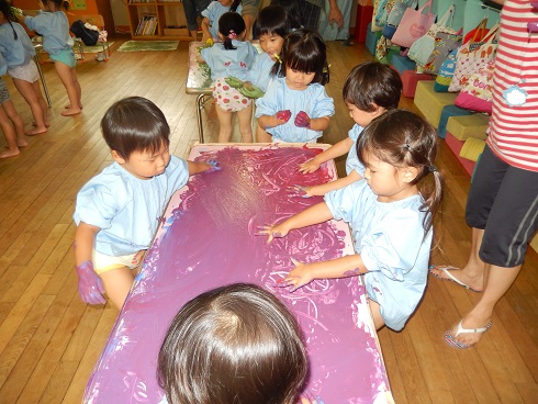 年少組は今日またまた絵の具遊びを行いました。