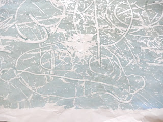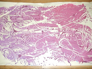 そして、今日はそのテーブルの絵の具の上から指で模様を描いて、紙に写し取るということもしてみました。