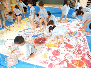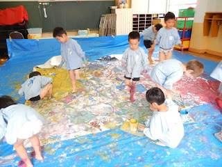 仕事着のお洗濯も、宜しくお願いします。沢山お手伝いいただいた、お母さん先生、本当にありがとうございました。絵の具の楽しさを充分に感じた子ども達でした。
