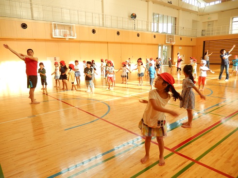 ラジオ体操第一をしたり、かけっこをしたり。バトンリレーにも挑戦しました。