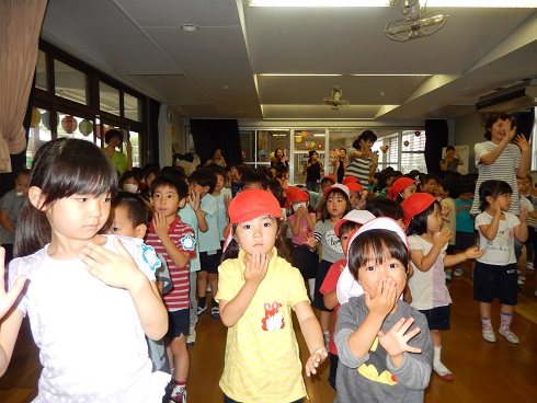 遊戯室で「盆踊り」です。♪あんぱんまん音頭 を踊りました。