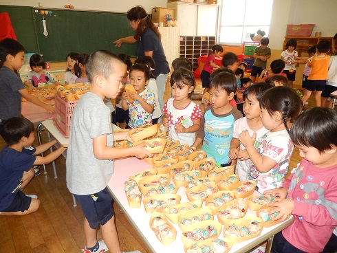 なつまつりは、お店の人を年長組が行います。2回に分けて行い、1回目と2回目でお店の人を交代します。