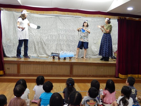 ジョニーというサーファーが年中組のみんなの前に現れました。このジョニー、伝説のビッグウェーブに乗るために練習をしているとのこと。