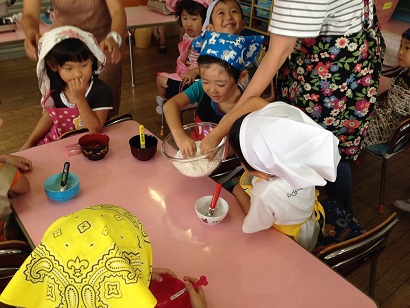 白玉粉に水を居れ、混ぜたものをみんなに分けていきます。