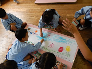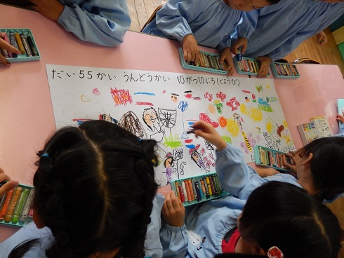 年長組の部屋に行くと、何人か集まって、一枚の画用紙に向かっています。
