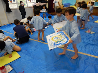 「おさんぽお絵描き」では、一人ひとりの紙を持って、自分の好きな色の絵の具のところまで歩いていき(おさんぽして)、お絵描きをするというもの。