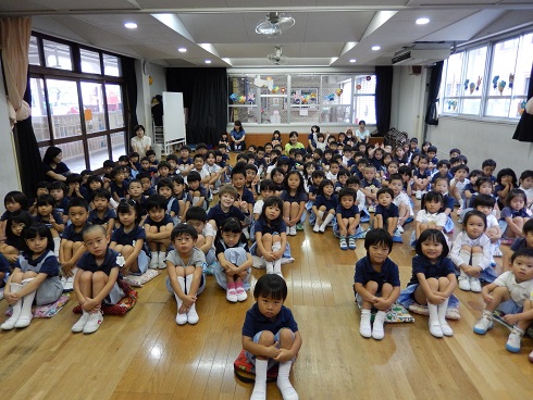 今日から2学期が始まりました。朝全員で遊戯室に集まり、始業式です。