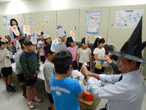 高校のお姉さんたちに「トリック オア トリート おかしをくれないといたずらしちゃうぞ」とみんなで言い、お菓子をもらいました。