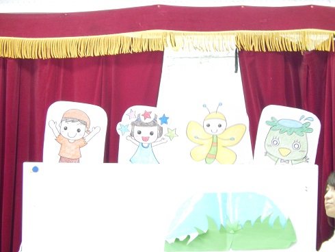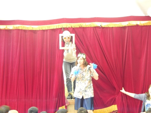 今日は、全員で遊戯室に集まって、各学年の踊りのストーリーを教えてもらいました。
