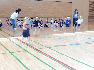 年少組のかけっこは、運動会の日にはゴール地点にいる保護者の方の元へ走りますが、