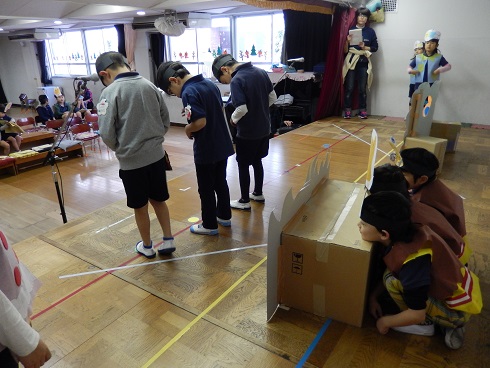 もちろん、生活発表会へ向けての活動も。段々と、自分達でお話を進められるようになってきた年長組の舞台の中からの様子です。