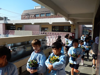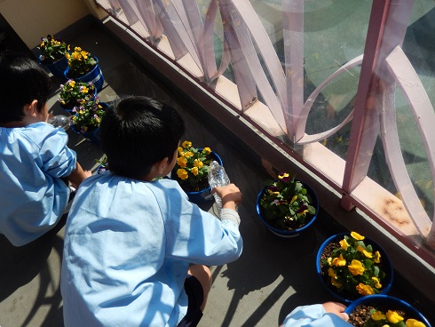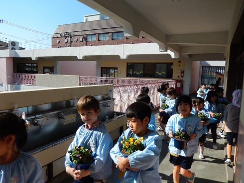 植え終わった鉢は大切に抱えて部屋の前へ。