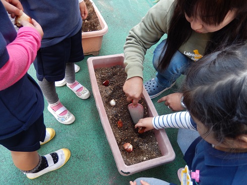 今日は、年中組のみんなで「チューリップの球根」を植えました。