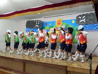 クラスごとの出し物。沢山のお客さん、カメラの前でも元気に踊っていた年少組。