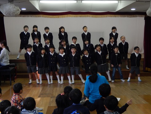 先生の指揮を見て大きな口を開けて歌っていました(大きな声という表現を使うと、金切り声になってしまう子もいるそうです。そのため、幼稚園では「大きな口をあけて」ということを伝えています。