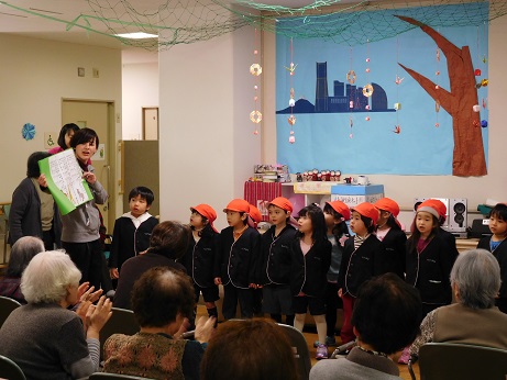 いらっしゃるおじいさん・おばあさんの前で、ちょっぴり緊張しながらも♪動物園にいこう!を歌いました。