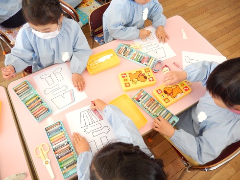 年中組は、各クラスで制作。スカート・ズボンや手足などが描かれた紙を手に、クレヨンで一生懸命色を塗っていました。