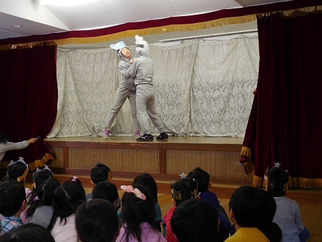 まずは、担任の先生が、お誕生日のお友達を前に呼びました。さくらぐみは1月のお誕生会の日に学級閉鎖だったので、今日一緒にお祝いです。