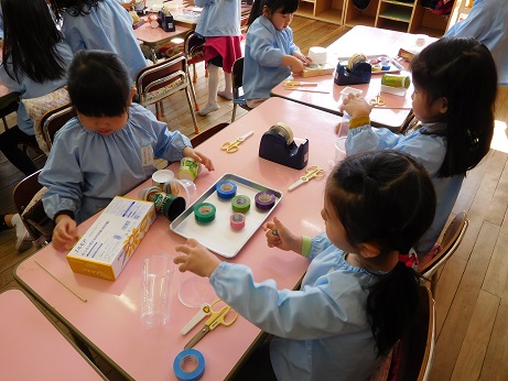 空き箱を使って、マラカスやドラムなどを作っていきました。