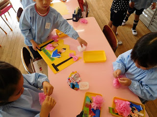 紙に貼り付けてぼんぼりを作ったり、お花紙でお花を作ったり・・・ちょっぴり難しいこともあったようですが、頑張っていました。