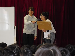 年少・年中が豆まきをし、大分弱っていましたが、最後に年長が豆まきをして退治しました。