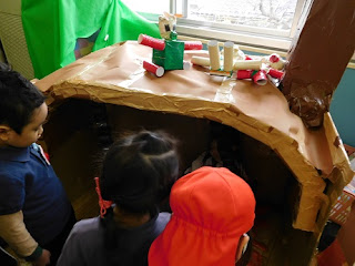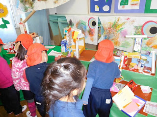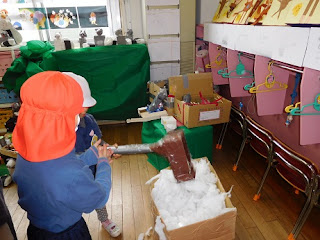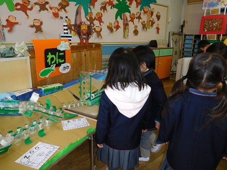 今日は、クラスの先生、友達と改めて幼稚園の全クラスの作品を見て回りました。