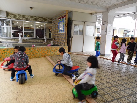 食後は、久しぶりに玄関で乗り物に乗れることを伝えると、大喜びで集まってきました。