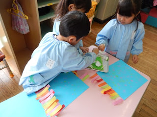 5月のこどもの日に向け、年長組と年中組は自分のこいのぼりを作っていました。