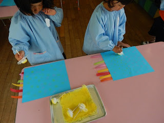 年中組は、「たんぽ」に絵の具をつけ、紙に色をつけていきます。