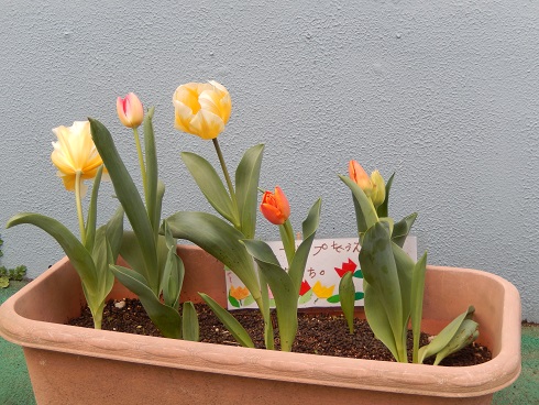 実は、春休み中に咲いてしまいそうだったので、日のあまり当たらないところに移動していました。