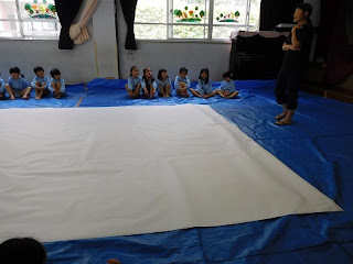 今日は年長組の絵の具あそび。ほしぐみが遊戯室に集まりました。