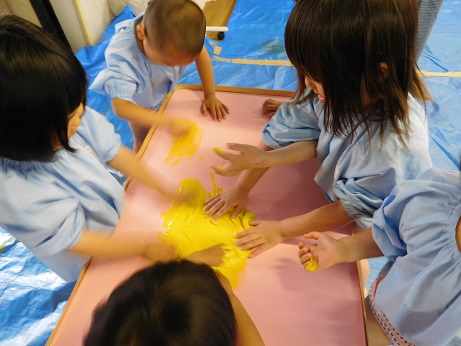 幼稚園では、この指えのぐで、絵の具のぬるぬるした感触や、色が混ざって変わっていく楽しさを味わっています。