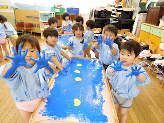 最初は青の絵の具。みんな手袋をしているかのように真っ青ですね。
