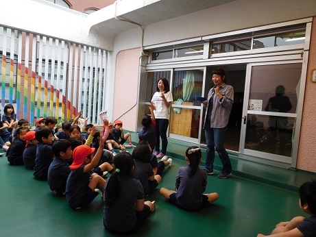 年長組さんがにじのテラスに集まって先生の話を聞いています。