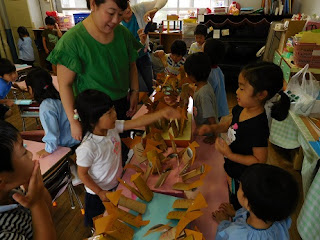 そして、お店の品物を少しずつ準備していましたが、今日は、年中組も一緒に品物作りです。